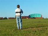 Der Drache fliegt sehr gutmütig und entwickelt erst beim Aufnehmen von Geschwindigkeit seinen Zug. Ich fliege ihn mit einem Rückengurt und normalen Vierleinerhandles. |