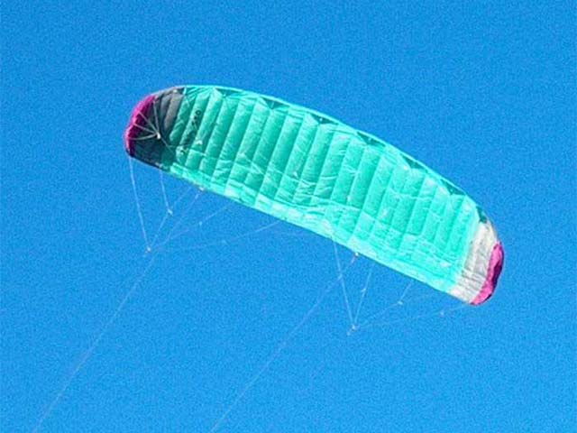 The kite is very forgiving and develops its drag only when accelerating. I fly it using normal quad handles and a hook around my back. |